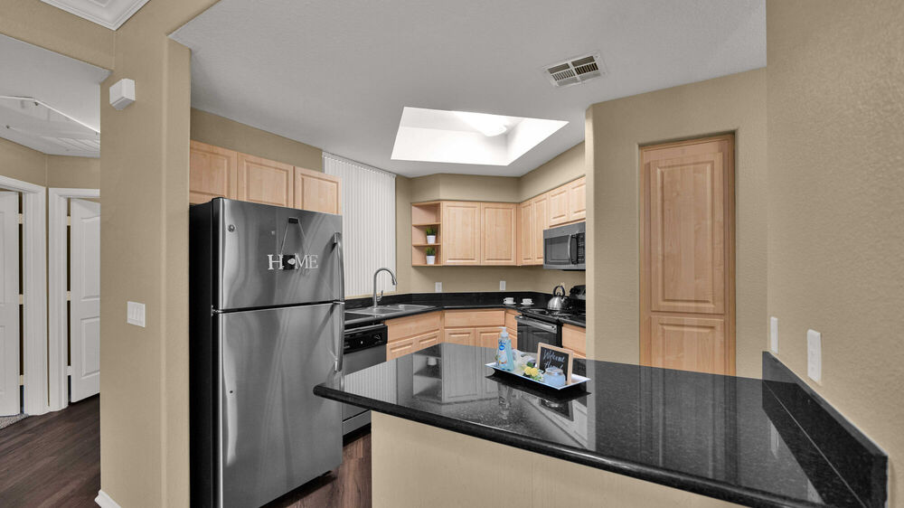 kitchen with granite countertops, expansive walk-in closets and a private patio